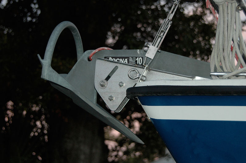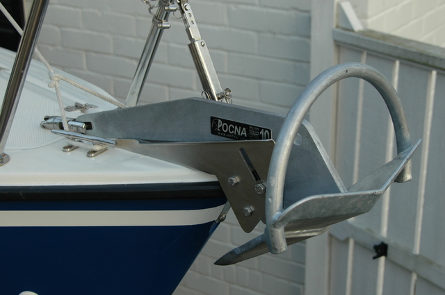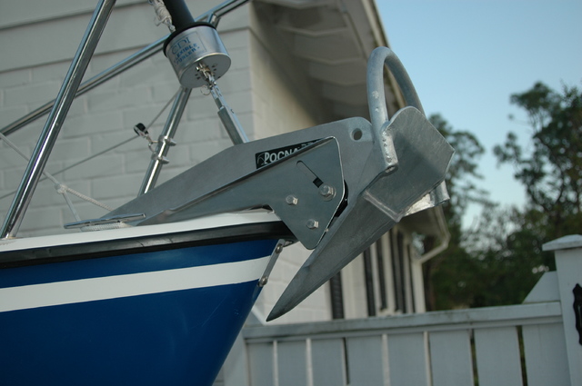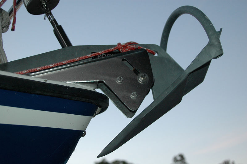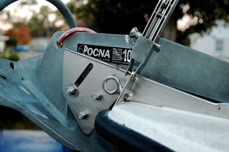 Bellaroo's Rocna anchor is probably one of the best additions to her inventory. Although rather pricey, the security when she's dug-in is worth every penny... The stock anchor mount was perfect for a small Bruce anchor, but the design was tested with less than acceptable results in the soft Florida sand.;I removed and replaced the stock roller with a Windline unit right off the WM shelf... The mounting was reinforced under the deck with a 1/8" aluminum plate after gaining access through the bow triangle in the V berth. Claustrophobia a constant concern, I jammed my 6' self into it and installed the backing plate as large as the area would allow and sealed it with a generous application of 5200. It's not coming off and it's not going to leak. Maybe the deck will separate from the hull, but the anchor roller won't come off. For security, the red line is cleated to keep that hook there until deployed. Wouldn't want an accidental anchor drag, because the Rocna doesn't drag - it digs. That may be when the deck would come off. — Michael Cantwell